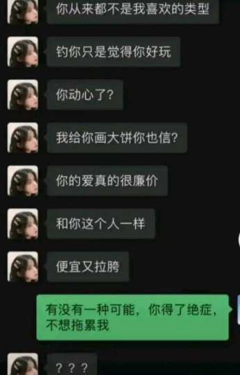 2、二是说奇怪的话,适合舔狗,比如有没有一种可能,你是我老婆,只是你忘了”“有没有一种可能,你得了绝症,不想拖累我”;
