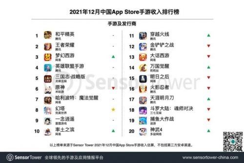 1 月 7 日消息。Sensor Tower 最新报告显示,2021 年 12 月苹果 APP Store 中国区手游收入排行前五位分别为:腾讯《和平精英》、腾讯《王者荣耀》、网易《梦幻西游》、腾讯《英雄联盟手游》、灵犀互娱《三国志・战略版》。