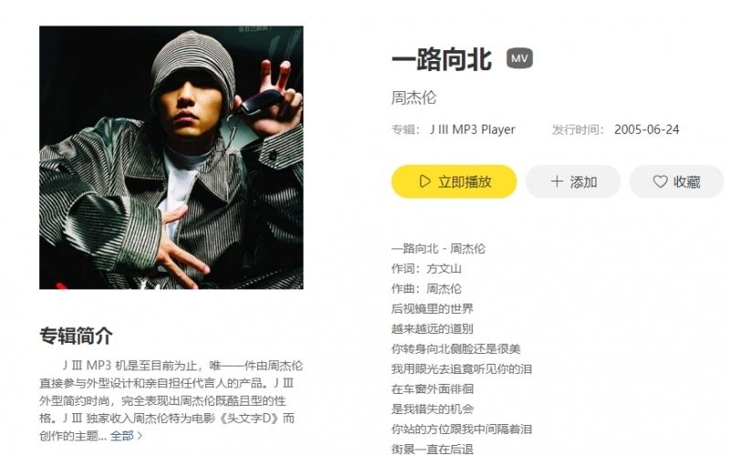 这首歌叫做《一路向北》,是周杰伦演唱的一首歌,,由周杰伦作曲,方文山作词,蔡科俊编曲。该歌曲是周杰伦主演的电影《头文字D》的插曲,于2005年6月24日随“J Ⅲ”MP3随身听的推出而发行,最早收录于周杰伦在2005年8月在日本发行的精选集《Initial J》中 ,后收录于周杰伦在2005年11月发行的专辑《十一月的萧邦》中。