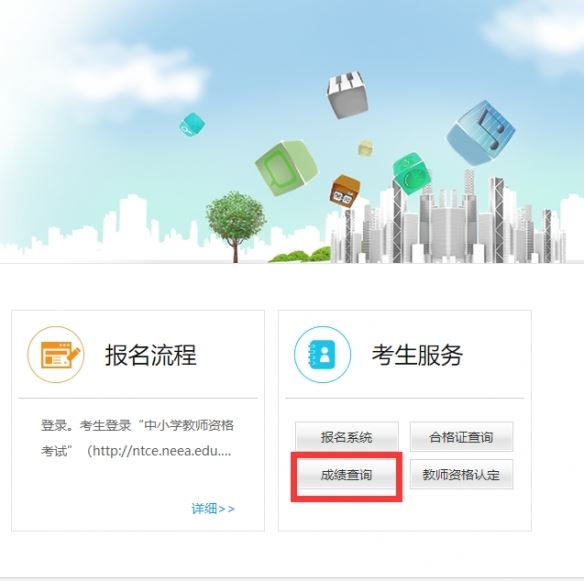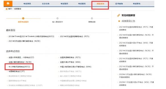 进入网站后点击上方【成绩查询】,选择考试项目【中小学教师资格考试(NTCE)】即可。