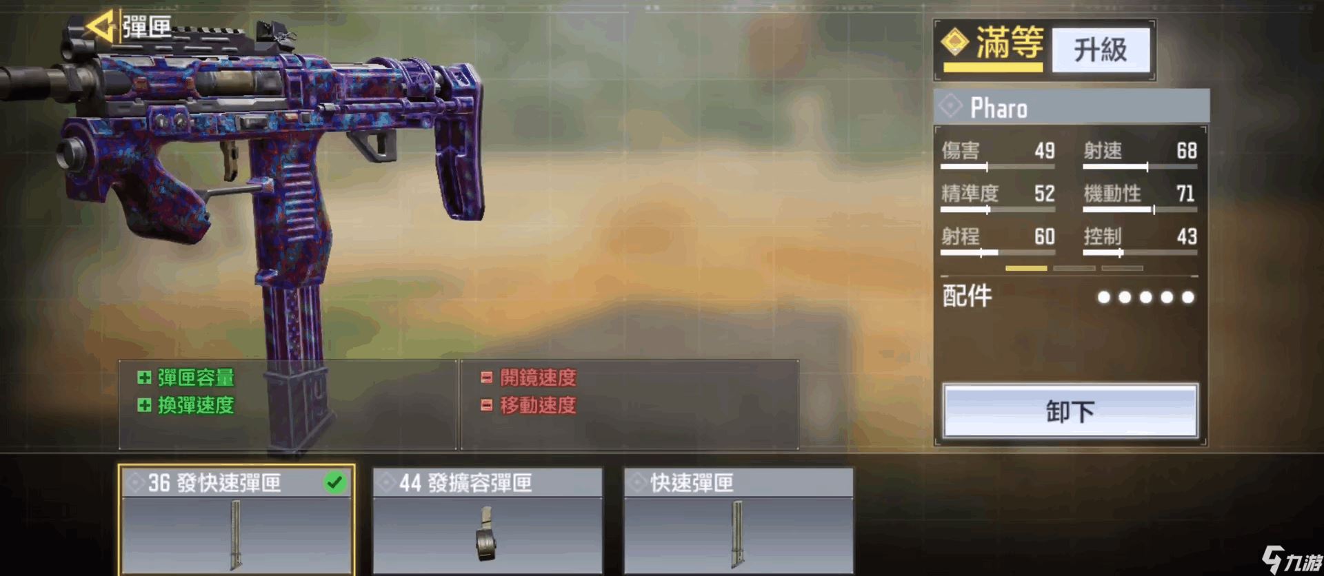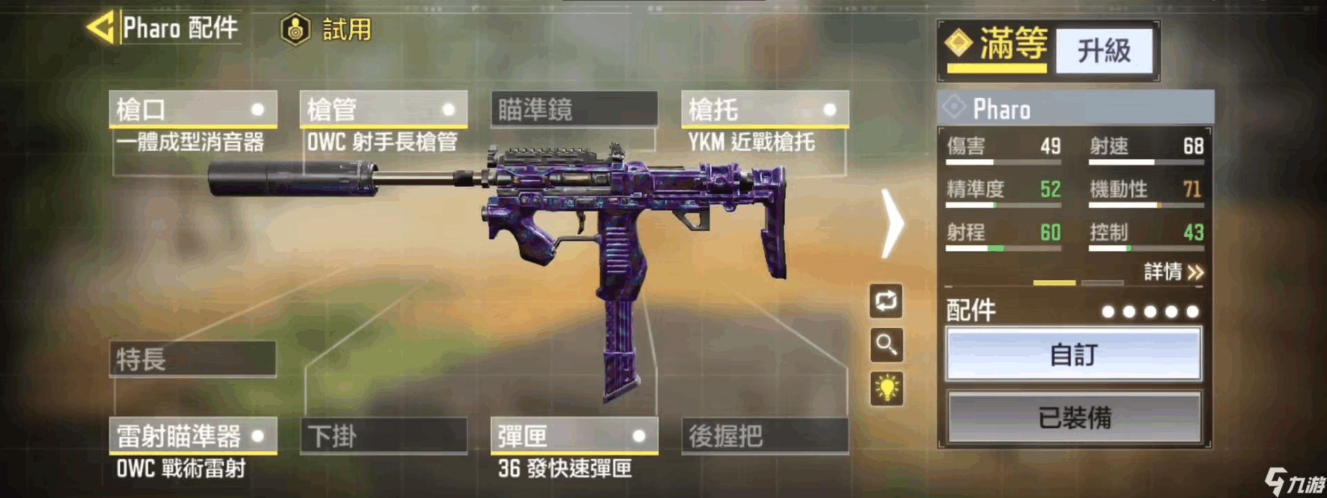 功能性配件方面选取的则是36发快速弹夹和DWC战术镭射。对于Pharo而言其基础载弹量过低难以经受其68的高射速,即便是使用44发大弹夹在战场上也会经常出现换弹频繁的现象,因此我们使用36发快速弹夹既提高了载弹量又加强了换弹速度,更为适合Pharo这把冲锋枪。