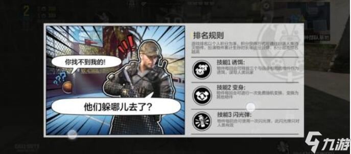 善用自己的三个技能。第一个为技能诱饵,可放置三个与自身所变成的物品相同的三个诱饵。第二个改变外观,可以更换自己的外观变成其他一个物品,这个技能可以结合最后一个技能闪光弹使用,在敌人致盲的情况下,改变外观或者逃跑都是不错的选择。