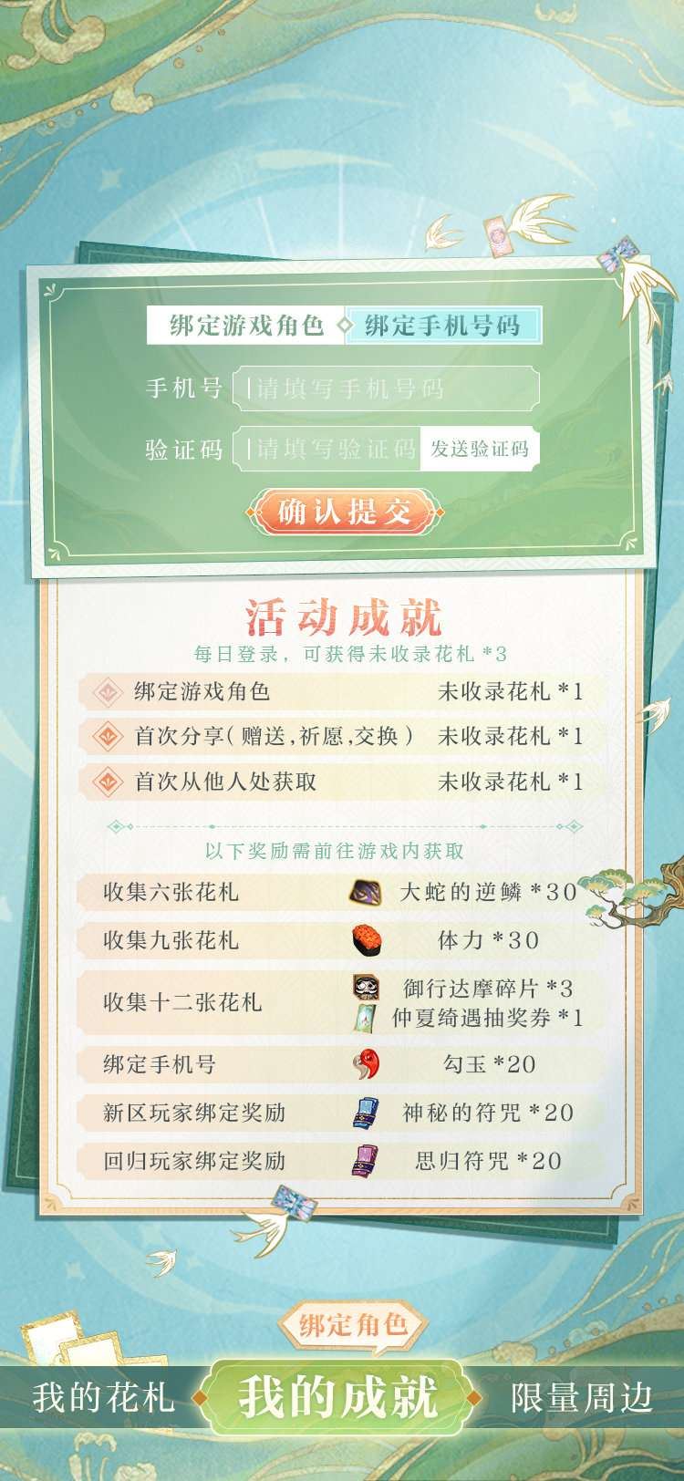※大人在活动界面绑定手机号可获得勾玉*20,新区新手大人与回归平安京的大人绑定游戏账号将分别额外获得「神秘的符咒」*20与「思归符咒」*20。