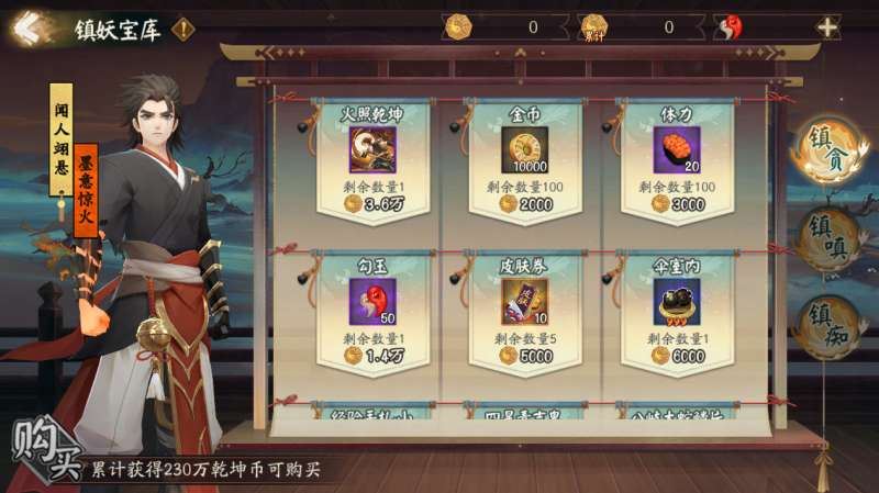 ※镇妖宝库:大人可使用收集的「乾坤币」兑换活动插画、闻人翊悬皮肤·墨意惊火、动态头像框「松烟山雾·义行」、御行达摩、SP/SSR式神召唤券等奖励。