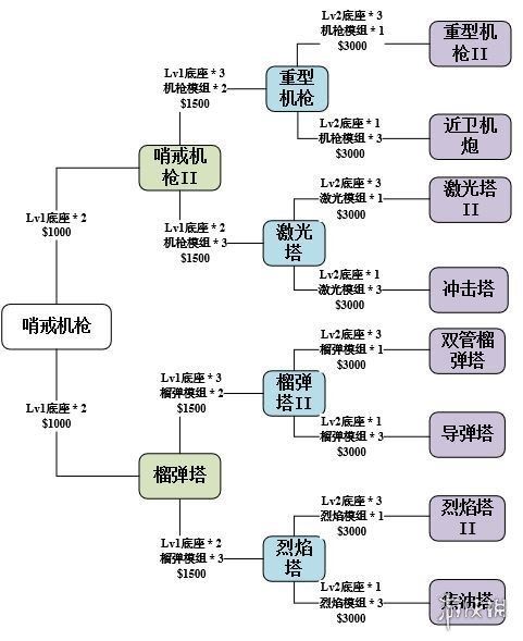 (烈焰榴弹塔):升级总共需要4个一级底座,3个二级底座,3个榴弹模组,1个烈焰模组
