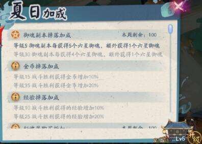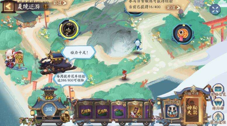 1、参与每周开放的限定活动获得花车经验提升等级,每周获取经验上限400,第一周限定活动为:百鬼逸闻。