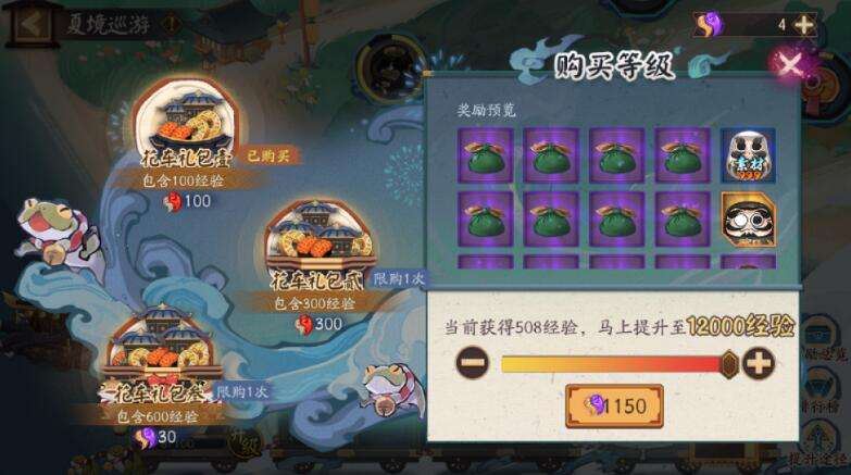 活动期间可以花费勾玉、氪金购买经验包补经验进度,经验包和每周获取经验上限共享,额外花费10魂玉可以提升1级进度。