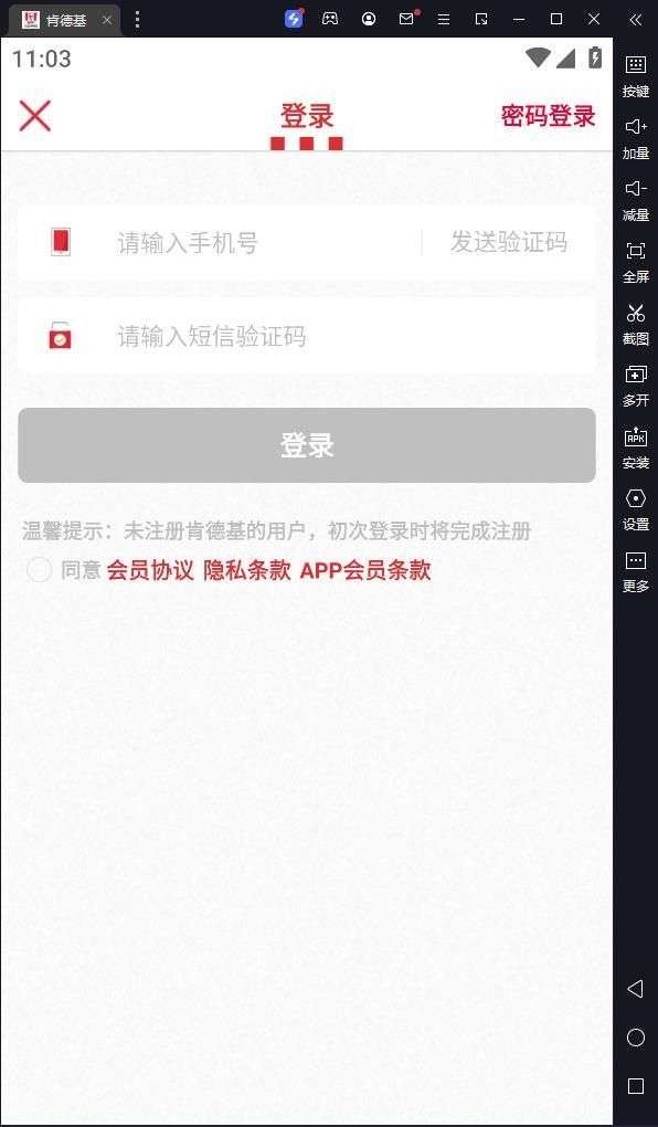 1.下载肯德基APP,然后进入到主页面进行登录你的信息,用户可以选择手机号和短信验证码进行登录,也可以账号密码进行登录。