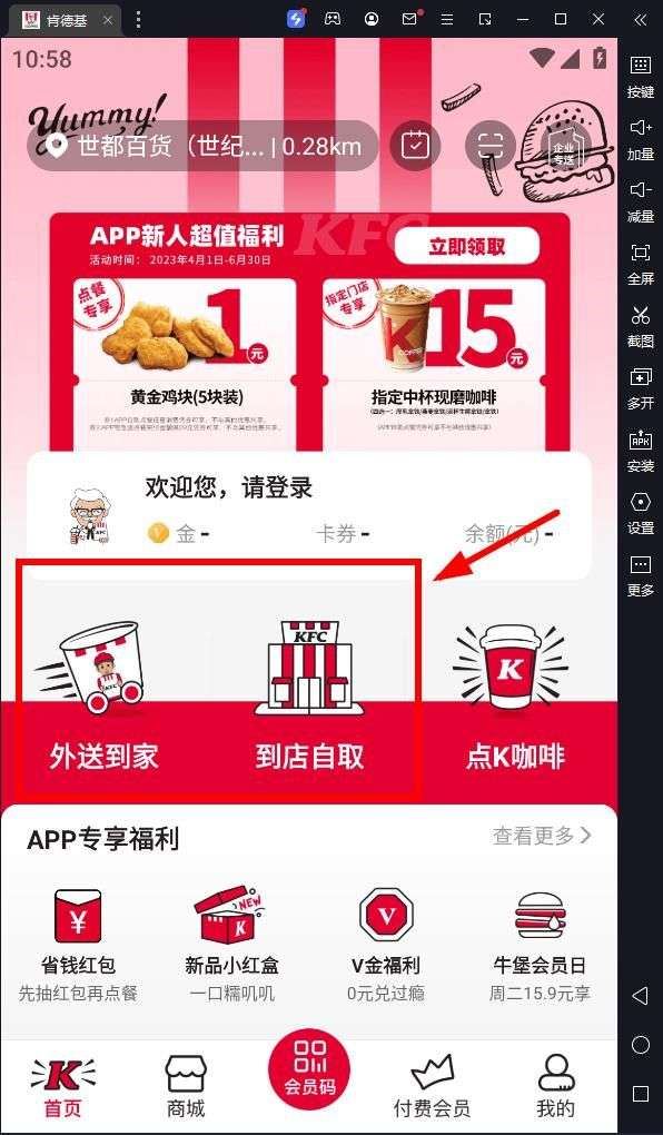 2.登录成功后,进入到主页面选择外送到家或到店自取进行到选购页面中。