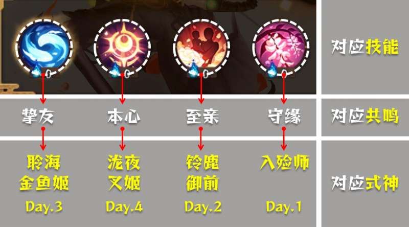 以下为大夜摩天阎魔的四个活动技能,分别对应了不同式神的不同情感共鸣,选择正确并反复使用至挑战成功即可。