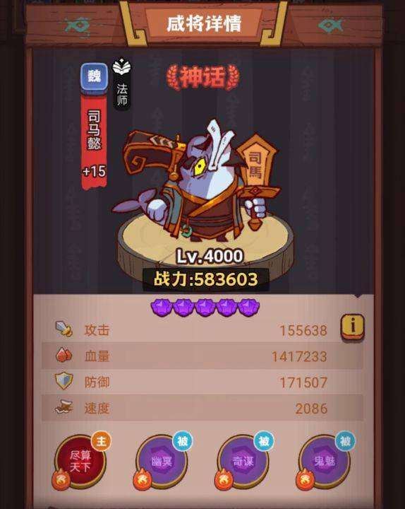 司马懿:司马懿是魏国神话品质的咸将,同样为法师,随着队友技能释放和回合数的增加,伤害会越来越高,可以放在后排负责支援。
