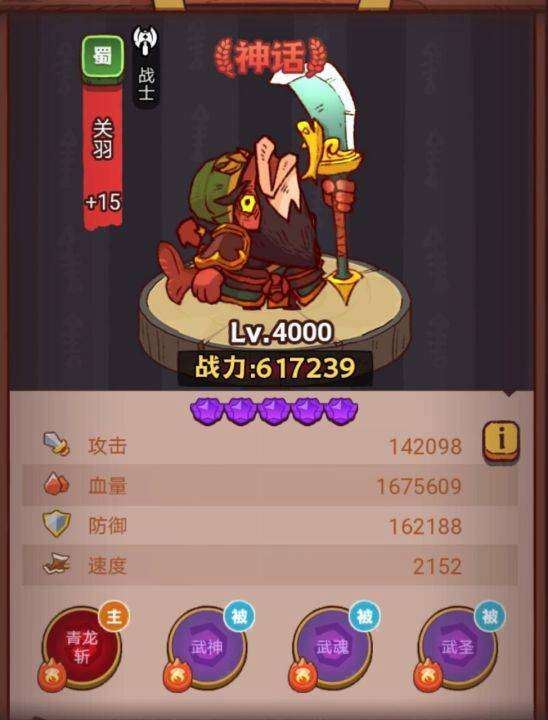 关羽:关羽是蜀国神话品质的咸将,场上位置是战士,拥有超高的伤害,大招青龙斩随着回合数的增加威力会变得越来越大。