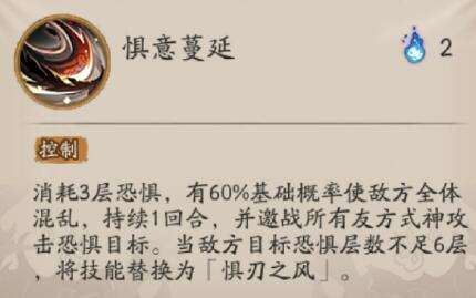 消耗3层恐惧,有60%基础概率使敌方全体混乱,持续1回合,并邀战所有友方式神攻击恐惧目标。当敌方目标恐惧层数不足6层,将技能替换为「惧刃之风」。