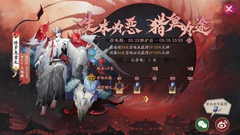 ※召唤期内获得SP修罗鬼童丸的概率将随召唤次数持续提升!