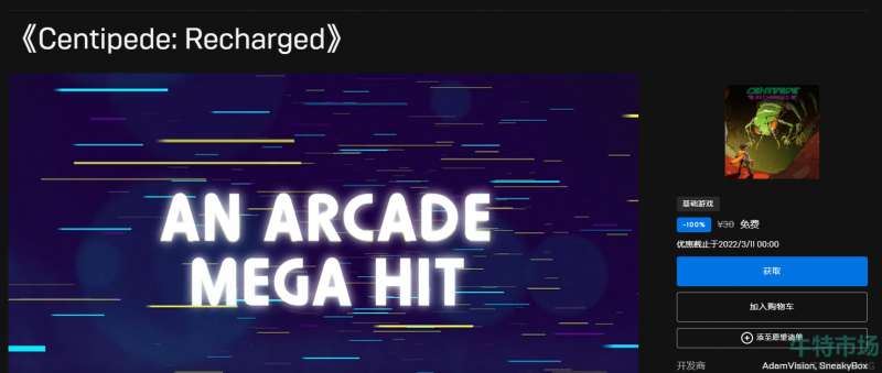 1、领取地址:https://www.epicgames.com/store/zh-CN/p/centipede-recharged