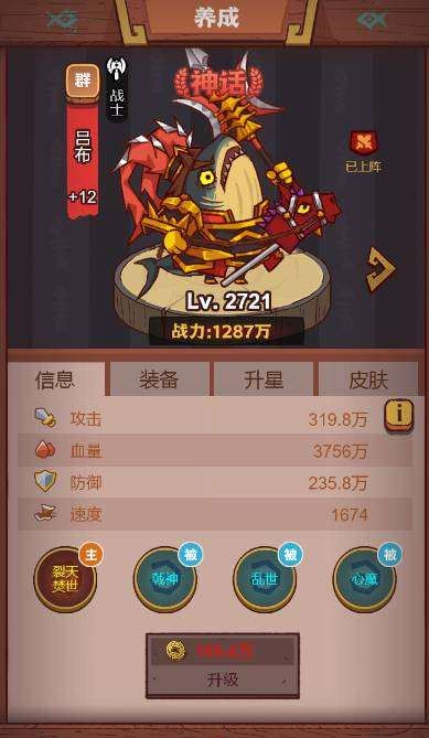 吕布:吕布是群雄神话品质的咸将,场上位置为战士,伤害极其可怕,生命值过低时会提升多个自身属性,可通过首充获得。