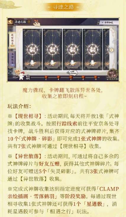 ※【现世相寻】:活动期间,每天将开放1张「式神牌」的收集战斗。按照行踪线索前往平安京各处寻找卡牌,战斗胜利后获得对应的式神牌碎片,集齐10个/式神牌·碎影」即可完成1张式神牌的收集。共有7张式神牌可通过【现世相寻】收集。