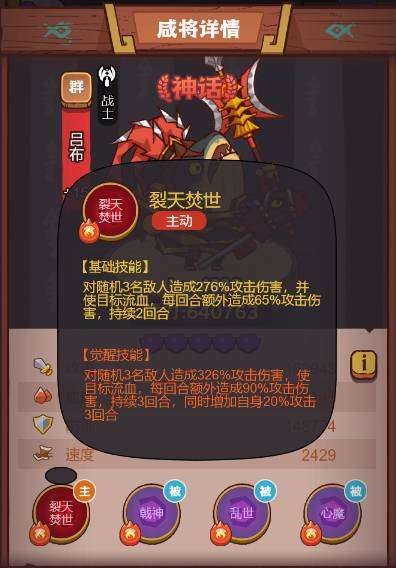 打法思路:吕布的主动技能裂天焚世的使用效果是对随机3名敌人造成276%攻击伤害,并使目标流血每回合额外造成65%攻击伤害,持续2回合。那么吕布的技能已经可以看出在整个战斗中吕布才是输出的核心,保护好吕布就是最好的打法!