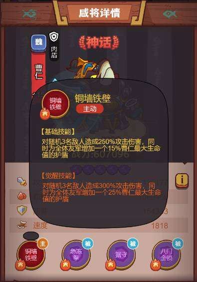 实战分析:看一下主力咸将曹仁的技能,对随机3名敌人造成250%攻击伤害,同时为全体友军增加一个15%曹仁最天生命值的护盾,再加上曹仁本身的肉盾属性,是一个非常抗揍的位置。这就从另一方面提升了队伍的坦度。