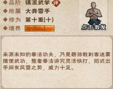 1.烟雨江湖大奔雷手属性是江湖武学、品阶是镇派武学、需要拳法修为150、攻击2230、招架1。