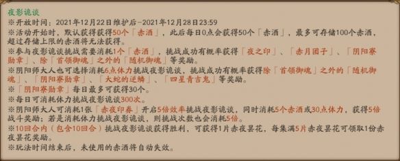 *阴阳师大人可消耗'赤酒'参与夜影诡谈玩法,获胜后可获得夜之印、随机御魂、阴阳寮勋章、大蛇的逆鳞、四星青吉鬼。