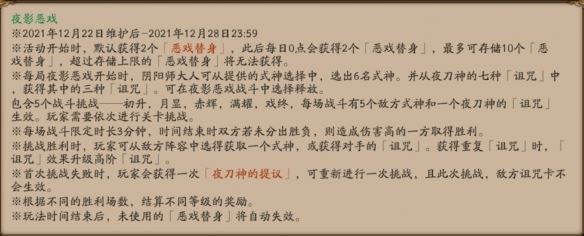 *阴阳师大人可消耗'恶戏替身'参与夜影恶戏玩法,每轮挑战共有5场战斗。