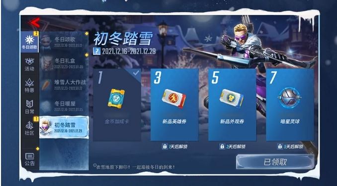 活动期间,累积登录1天、3天、5天、7天可分别领取[金币加成卡、[新品英雄券]、[新品外观券]、[暗星灵球]。