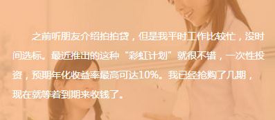 按照事先确定的预期收益率自动投资拍拍贷平台上的借款标的。使用期结束后,拍拍宝将帮助您对其所持有的债权通过债权交易平台进行转让。转让成功后,您可以收回全部投资本金和相应的收益。彩虹计划是无法提前退出的,到期后才能自动收款。