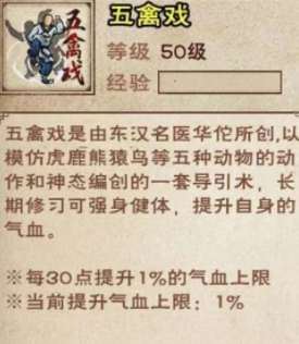 7、五禽戏秘技无法通过读书方式升级,只能通过药王指点升级,一天可进行3次指点,直至满级。