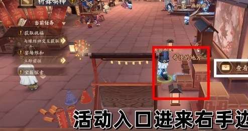 1、第一个,进入游戏中,我们点击活动入口然后来到缘结神对面,靠近右手边奇怪的地方我们查看一下;