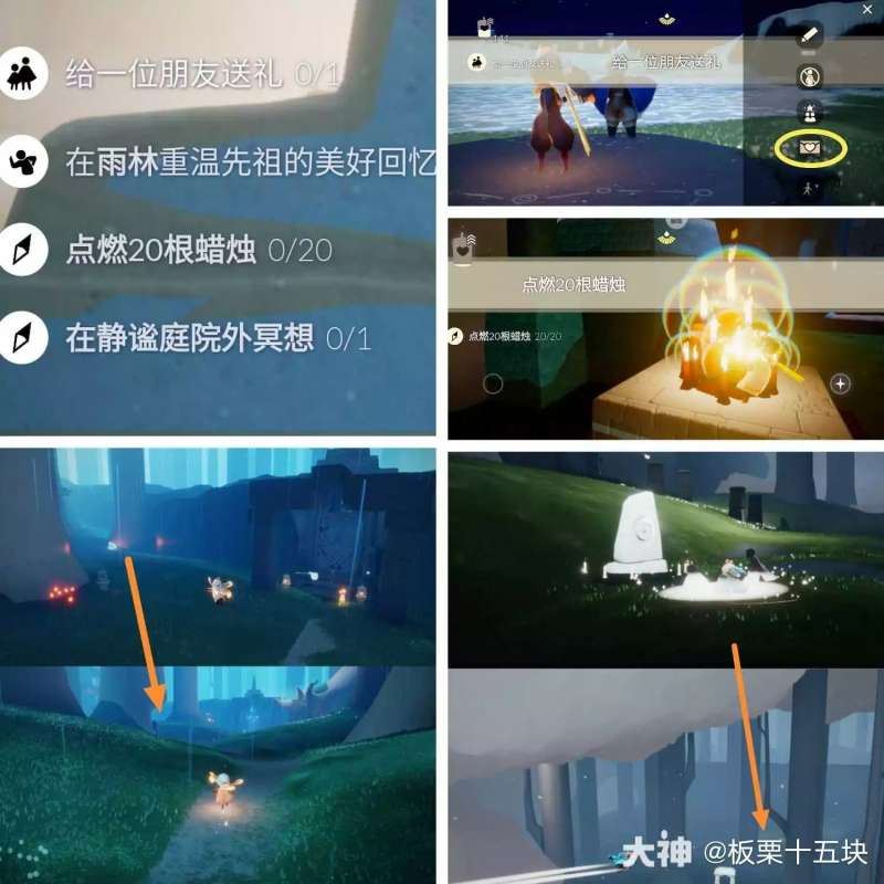 2、第二个每日任务是:在雨林重温先祖回忆:先祖位置在雨林静谧庭院图,和荧光森林交界的铁门左侧