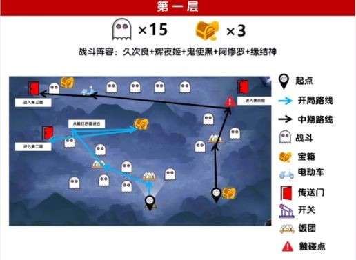 1、第一层:首先我们需要根据蓝色路线移动到第二层,(黑色路线先不用处理)。
