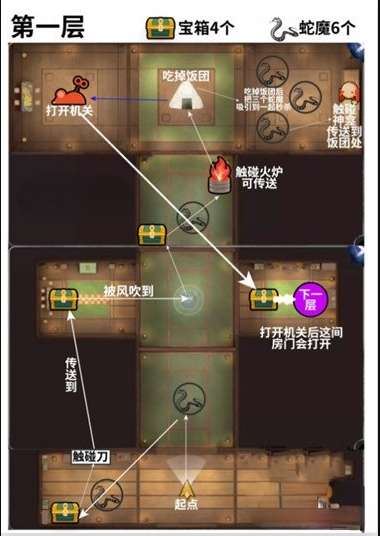 1、第一层,一共四个宝箱集齐即可进入第二层,首先触碰刀刃清理魔蛇,吃掉饭团打开机关然后传送到饭团处击杀魔蛇即可;