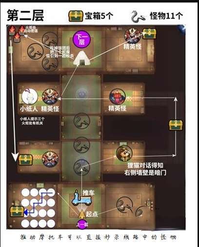 2、第二层,使用小电车直接直接将中间的魔蛇清理,按照图中指示先和狸猫对话然后再清理怪物拿到宝箱即可进入下一层;