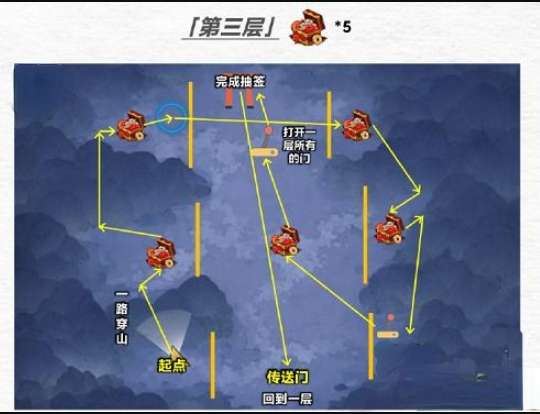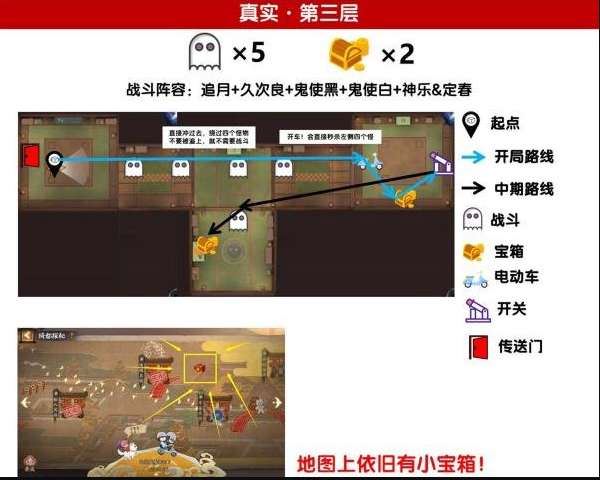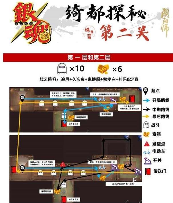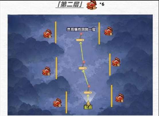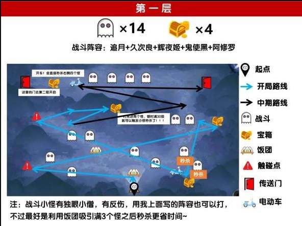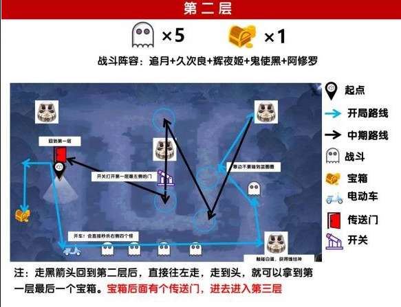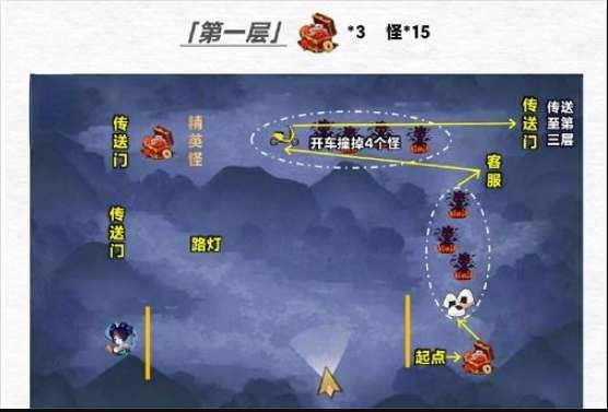 1、第一层和第二层需要按照下图中的线路进行通关,遇到小电动车道具直接使用对怪物进行秒杀;