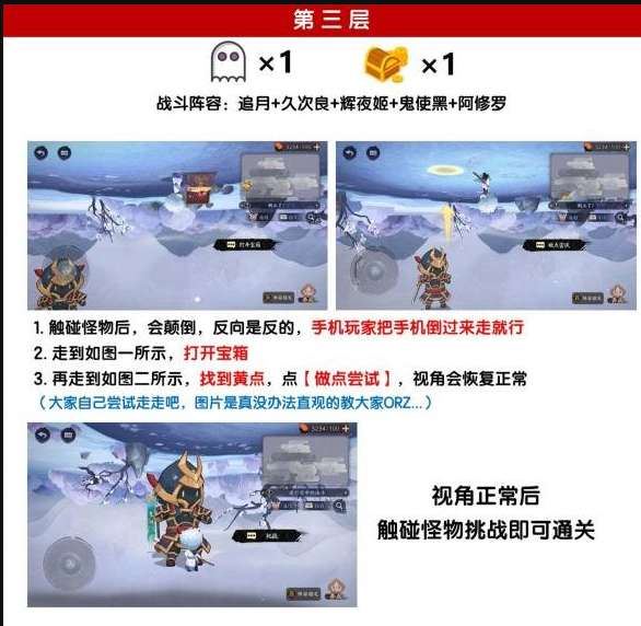 3、第三层,进入第三层当我们碰到怪物时,我们的屏幕会变反方向,我们朝着反方向的一面(正面)找到一个黄色亮的区域,点击一下视角就可以恢复,恢复好视角点击怪物进入战斗,战斗通过即可通过;