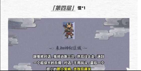4、第四层,我们再次回到一层就可以看到第四层的入口,我们需要和进去的鬼将对话三次,鬼将会逃跑,我们地图上面走会碰到NPC对话完会有一个佣兵击败即可通过;