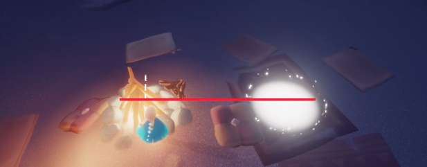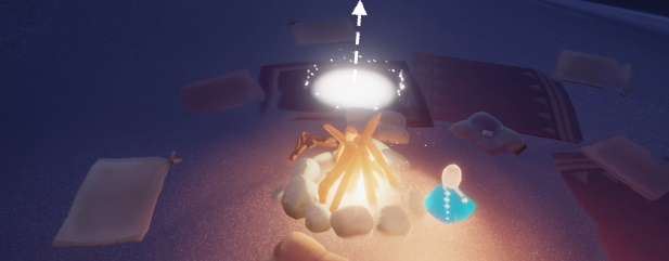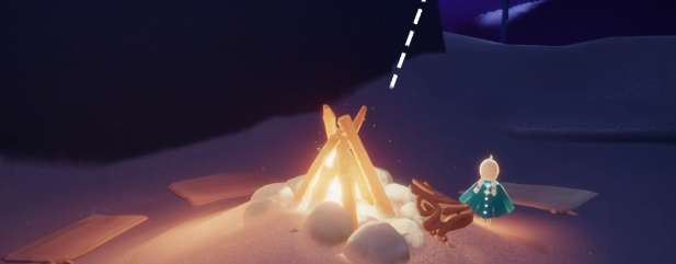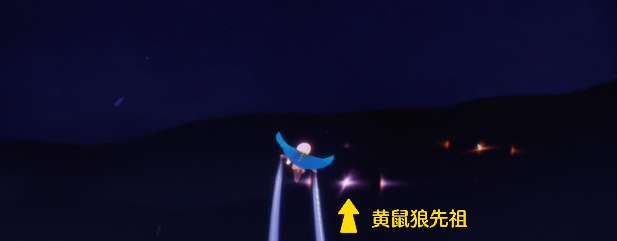 3、首先以打坐处和篝火为一条直线,我们可以沿着这个方向向前直飞,飞一段距离后就可以看到黄鼠狼先祖;