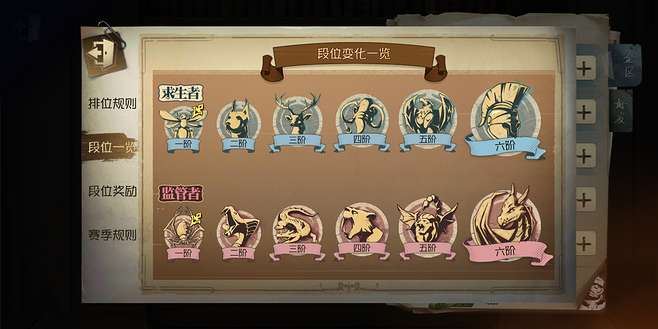 首先,每场游戏玩家都可以选择是作为求生者还是监管者来参与比赛。正常的排位赛,求生者共有四名玩家,监管者只有一名,一些活动玩法会增添求生者以及监管者的数量。因此游戏的段位也就分为了求生者段位以及监管者段位,这两者的段位大体上都是相似的,都是分为6个等级,最低是一阶,最高是六阶。每一个段位都有不同的图标来代表,求生者的段位大都是昆虫、鹿、老鹰等看起来聪明敏捷的动物,监管者就是蜘蛛、蛇、鳄鱼等看起来比较残暴的动物,阶位越高,动物看起来就越强,求生者的六阶是一个士兵的盔甲,监管者的六阶是一只喷火龙,看起来都实力超凡。在每个阶位中又存在许多不同的小段位,就比如一阶中又分为三个小段位,二阶分为四个小段位,其他阶位就以此类推,越往上需要打的小段位就越多。当玩家达到六阶以后,就没有小段位了,排名则依据玩家的游戏实力。