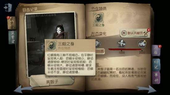 红蝶是监管者的一名角色,能够切换三种不同的形态,玩法多样。切换三种形态是因为红蝶的被动技能叫做三相之身,分别是美人相、般若相以及惊慌相。美人相的攻击能力比较小,但是移动速度极快,在追人的时候可以切换这个形态。般若相对求生者的恐惧范围会更大,并且移动速度也会随之变慢。惊慌相和般若相恐惧的范围是一样的,移动速度也比较慢。接下来给大家介绍第五人格红蝶的详细技能。