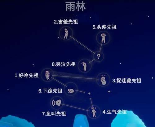 光遇雨林先祖位置在哪?光遇雨林共有8位常驻先祖,发抖先祖、害羞先祖、生气先祖、抱头先祖、磕头先祖、鱼叫先祖、哭泣先祖,下文就是关于光遇雨林先祖位置图解,一起来看看吧。