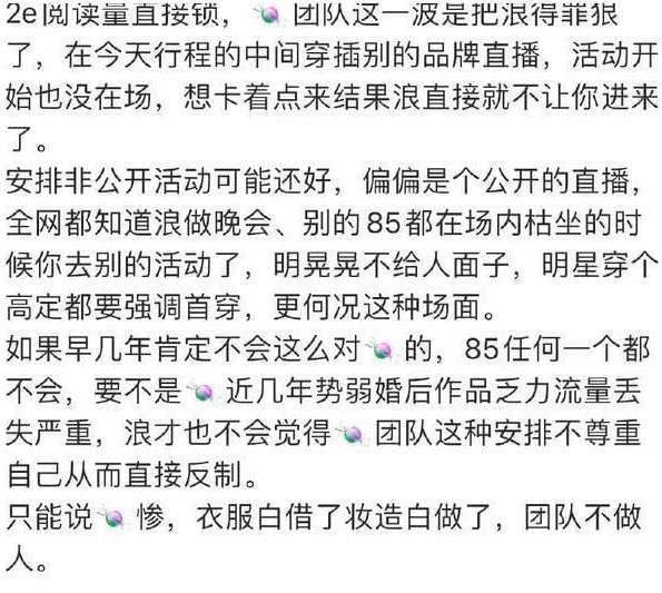 整个事件槽点太多了,首先是唐嫣的工作团队没有协调好时间,如果提前把品牌直播和微博之夜的时间错开就不会导致艺人赶场了。两个活动相比,微博之夜显然更加重要,对艺人的曝光度更多。可是唐嫣却明晃晃把它排在别的工作后面,难免会得罪主办方。另外,粉丝大喇喇地把唐嫣被拦在门口不让进这事讲出来也不合适。或许粉丝说出来是想让网友怜爱唐嫣攻击微博之夜,但说到底唐嫣进不去是因为她迟到了,晚会主办方不给她面子也有正当理由。粉丝如此广而告之,只会让唐嫣更加尴尬。