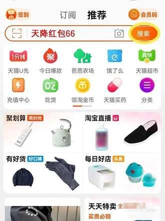 2、进入淘宝首页,在顶部搜索框中输入「天降红包66」,然后搜索。