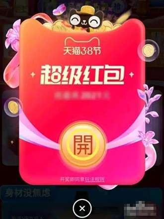 3、搜索后会跳转到38节红包会场,同时会跳出领红包的弹窗,点击弹窗上的“开”即可领红包。