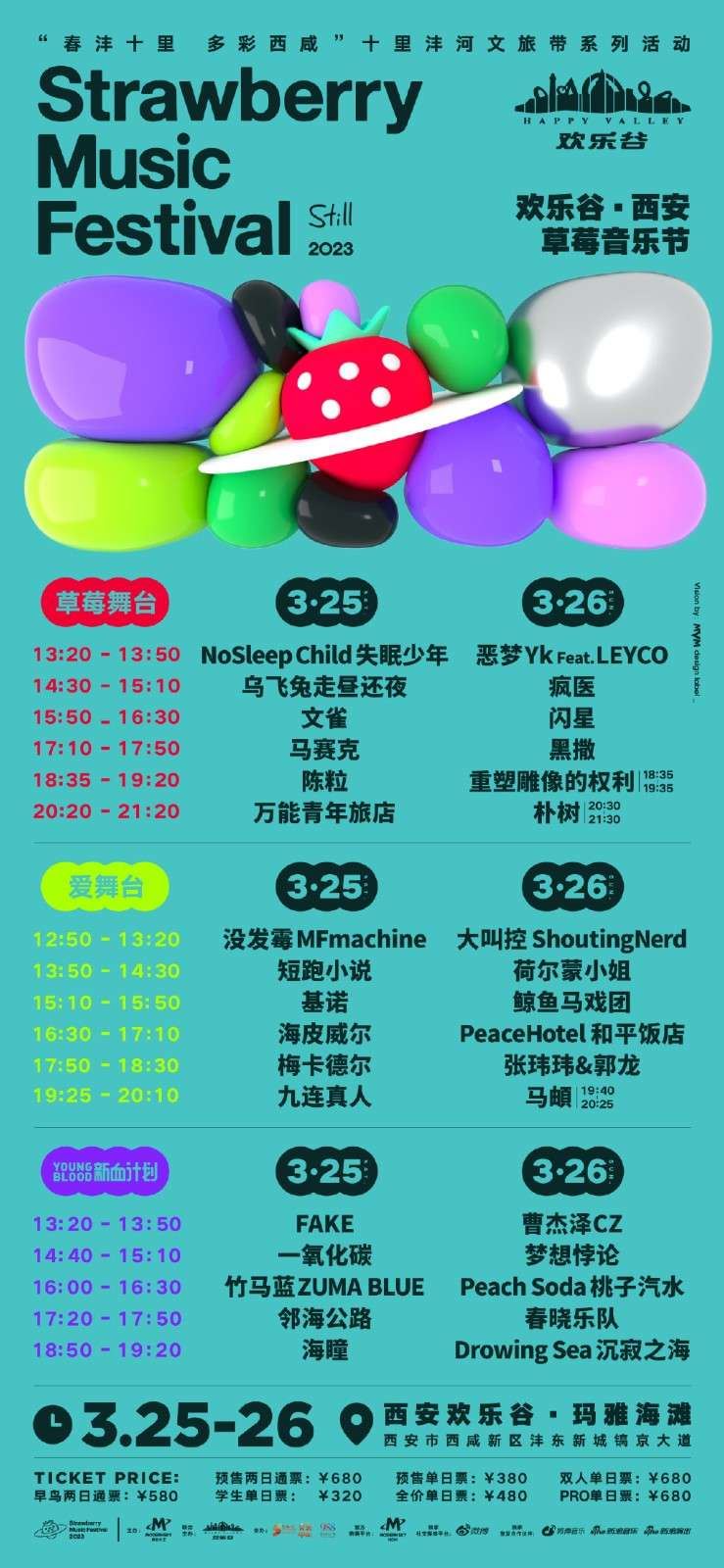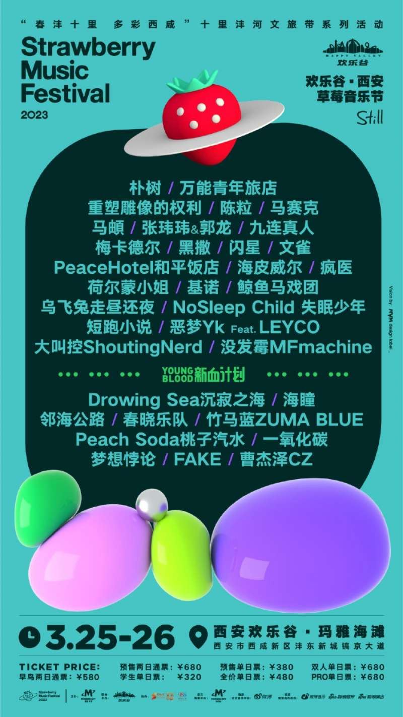 2023西安草莓音乐节阵容公布,朴树、万能青年旅店、重塑雕像的权利、陈粒、九连真人、马頔、马赛克、张玮玮&郭龙、黑撒等音乐人/乐队参演。