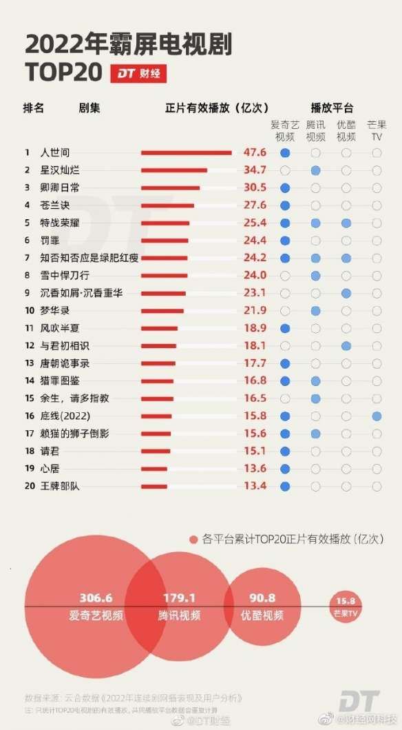 本篇带来2022年霸屏电视剧TOP20总结内容,感兴趣的小伙伴们一起来看看吧,希望能够帮助到大家。2022年爱奇艺首次实现全年盈利。2月22日美股盘前,爱奇艺(IQ.NASDAQ)披露2022年第四季度和全年业绩,全年总收入290亿元,净利润13.1亿。据DT财经统计,2022年霸屏电视剧TOP20中,在爱奇艺播放的共有13部,其中排名前五里,爱奇艺占四席。
