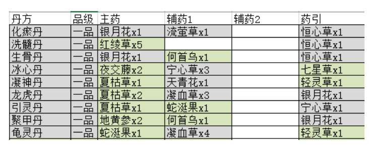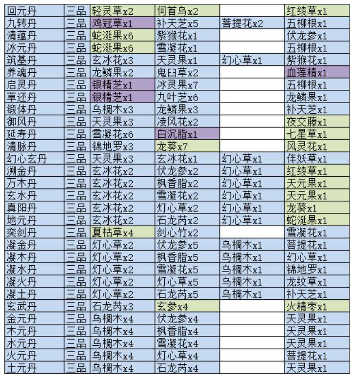 一品丹药包括化瘀丹,洗髓丹,生骨丹, 冰心丹, 凝神丹 ,龙虎丹, 引灵丹 ,聚甲丹, 龟灵丹。