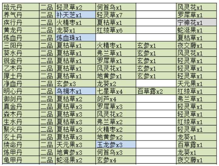 二品丹药包括培元丹, 养气丹, 疾行丹, 黄龙丹 ,炼血丹, 三阳丹, 葵水丹, 锐金丹 ,乙木丹 ,厚土丹 ,净血丹 ,明心丹 ,御剑丹 ,真金丹 ,森木丹 ,生水丹, 聚火丹, 玄土丹 ,续命丹, 炼甲丹, 龟甲丹。