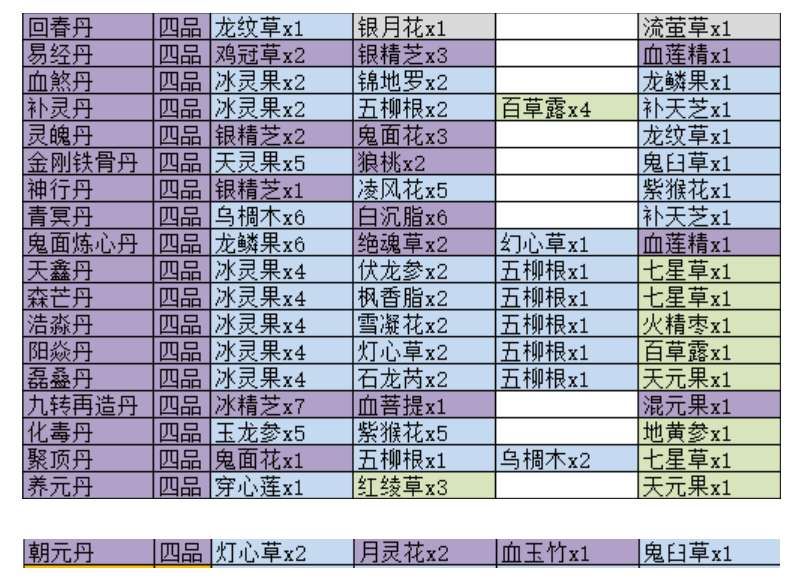 四品丹药包括回春丹,易经丹, 血煞丹,补灵丹,灵魄丹,金刚铁骨丹,神行丹,青冥丹,鬼面炼心丹,天鑫丹,森芒丹,浩淼丹,阳焱丹,磊叠丹,九转再造丹,化毒丹,聚顶丹,养元丹,朝元丹。