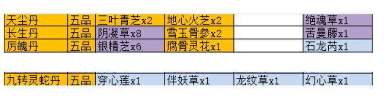 五品丹药包括天尘丹 ,长生丹 ,厉魄丹 ,九转灵蛇丹。